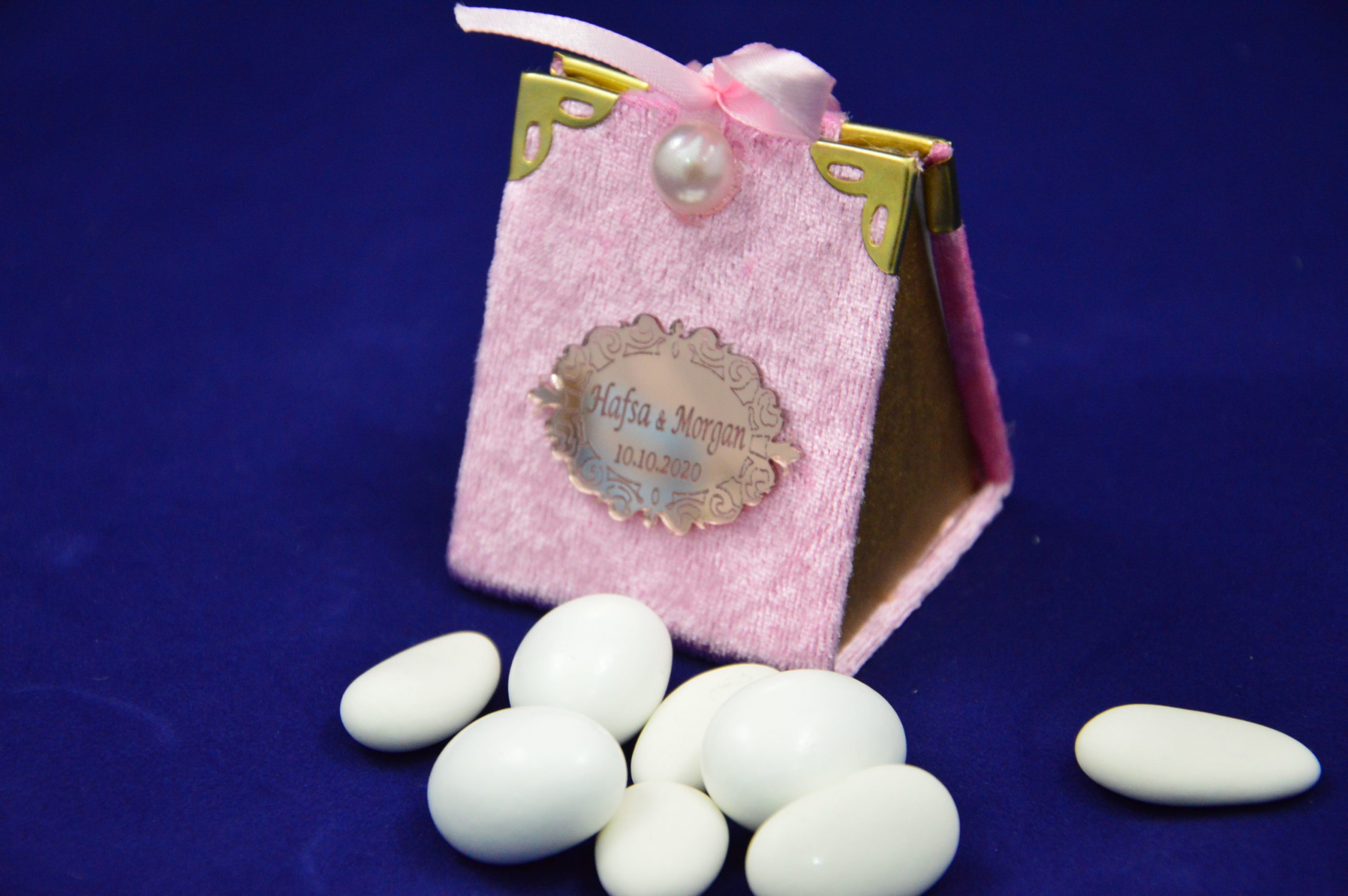 Boite à dragées recouverte de velours de couleur rose.