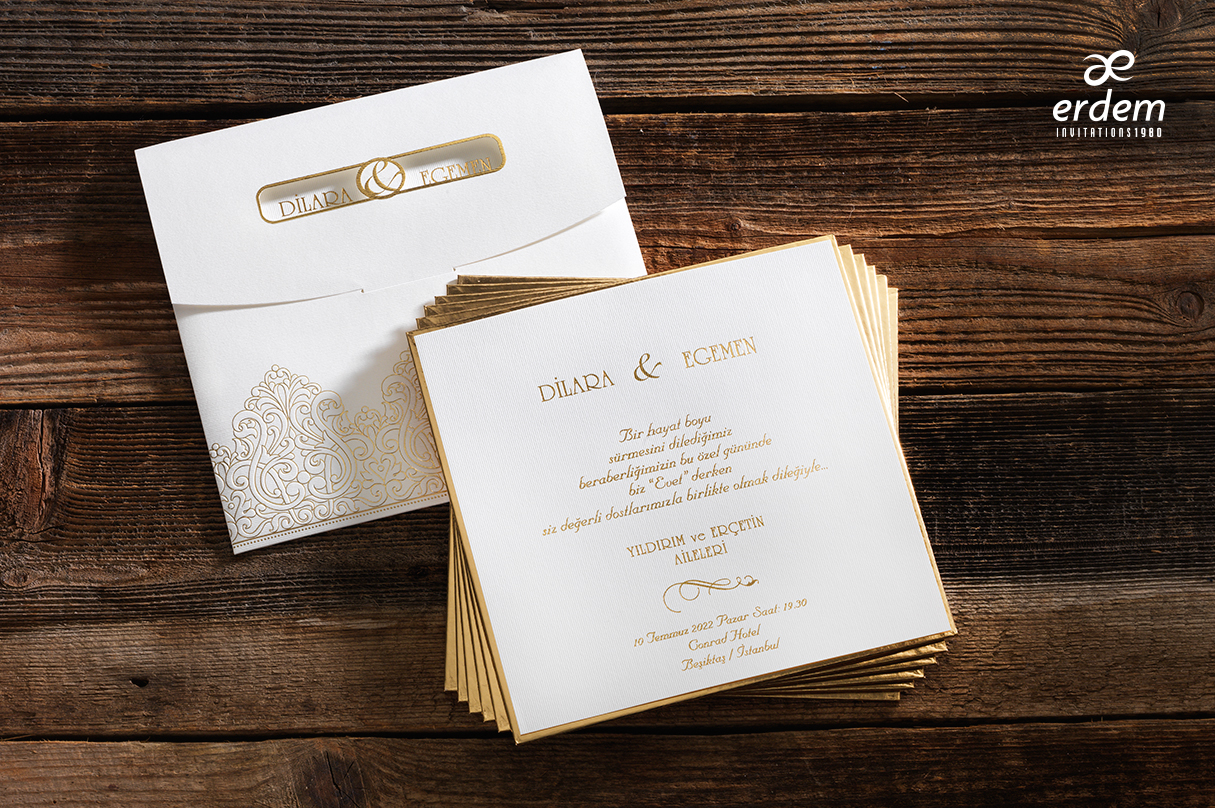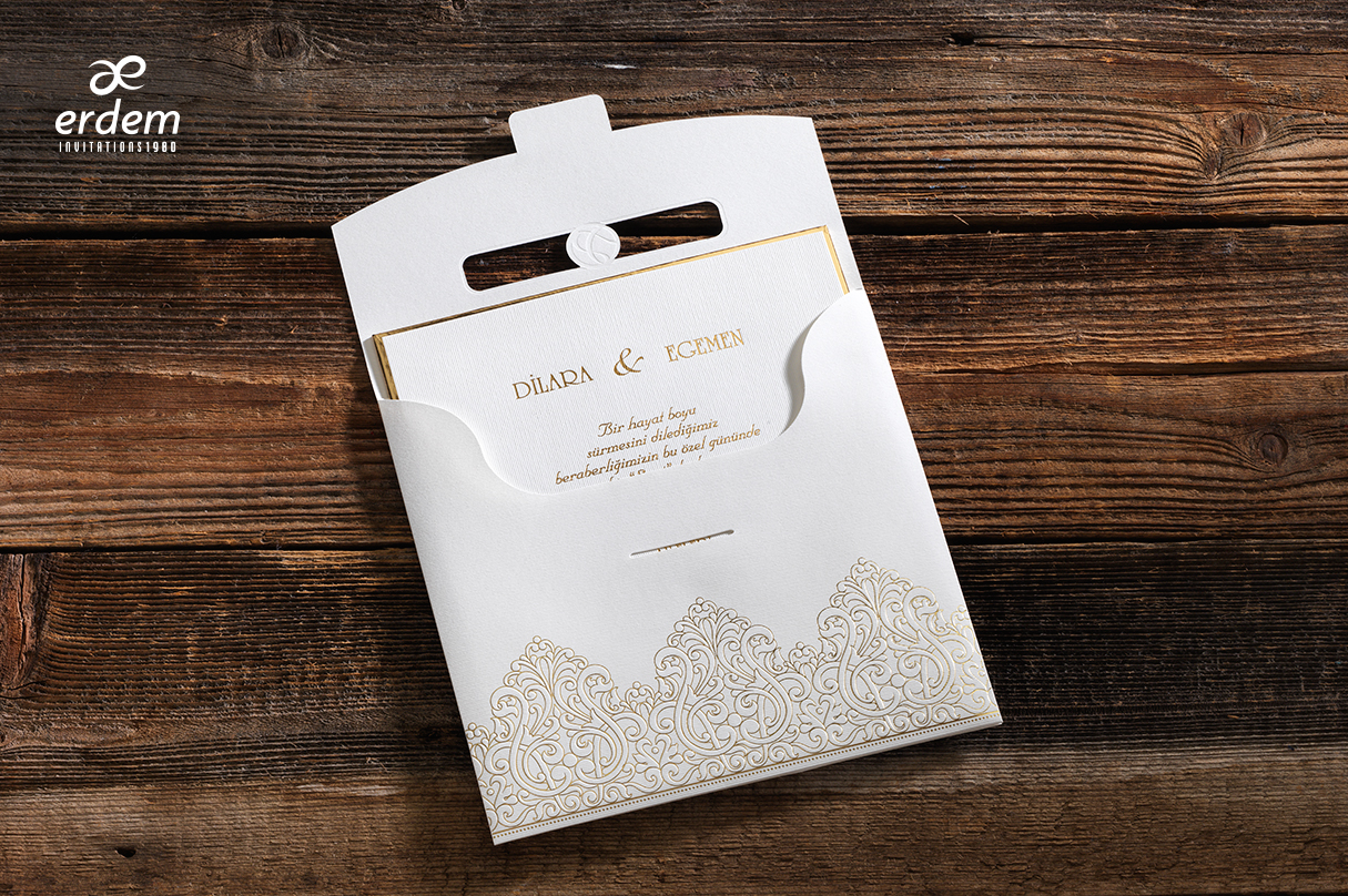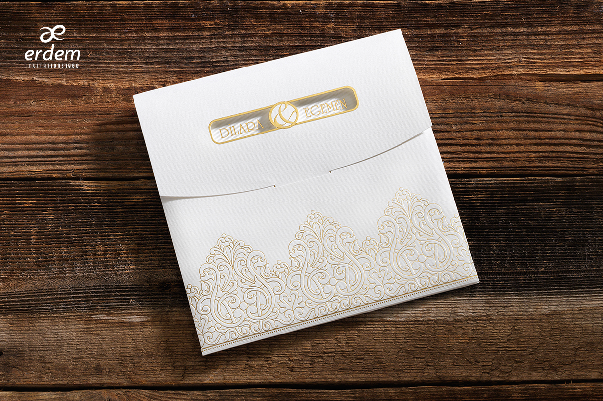 Puis le dernier élément st la pochette. Elle de couleur blanche avec quelques motifs de couleurs dorés en arabesque. Ainsi elle possède une ouverture qui permet de faire ressortir les prénoms ou la date ou autre.