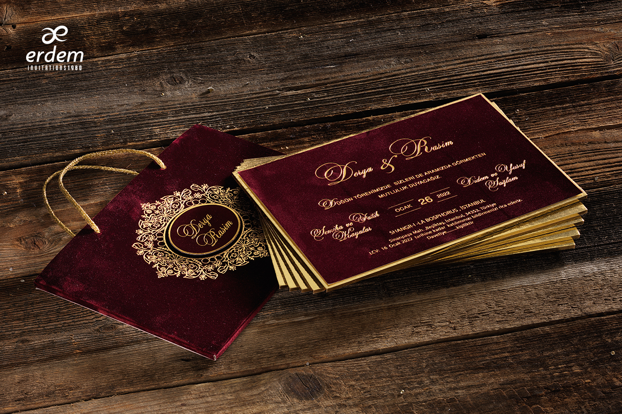 Tout d’abord, le premier élément est la feuille du faire part. En effet cette feuille est assez original étant donné qu’elle est entièrement recouverte de couleur. Toute la feuille est recouverte de velours de couleur rouge. Il faudra donc effectuer par dessus une impression en dorure à chaux. L’attente est d’un mois pour pouvoir les préparer par rapport à une impression en encre normale qui prendra trois-quatre jours.