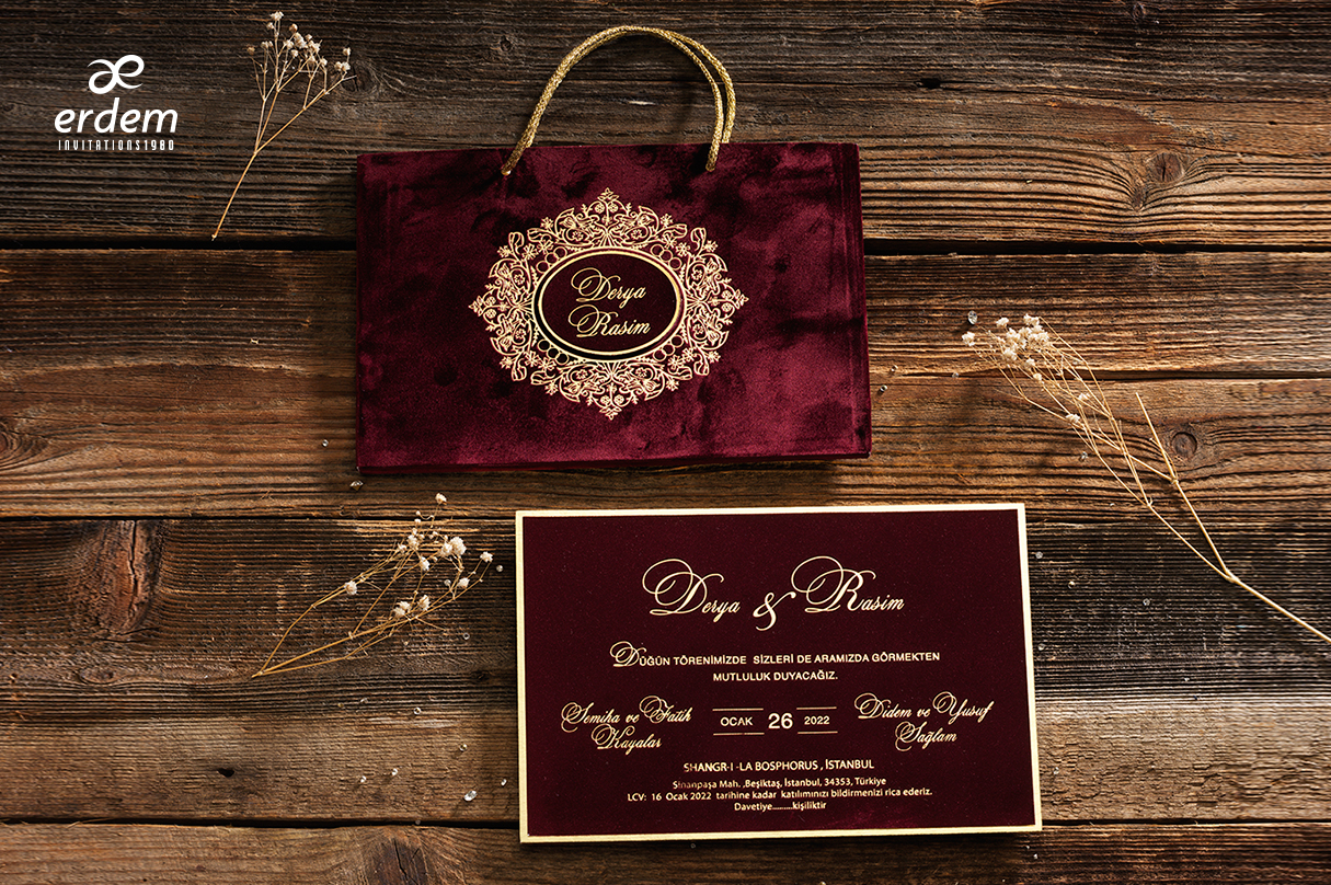 Enfin le troisième et dernier élément est le sac dans lequel on glisse le faire part. Ainsi il est assez original car à la place d’une enveloppe il y a un sac. Il est entièrement recouvert de velours rouge avec des motifs en arabesque dessus au centre. Au milieu les prénoms des mariés y est imprimé.