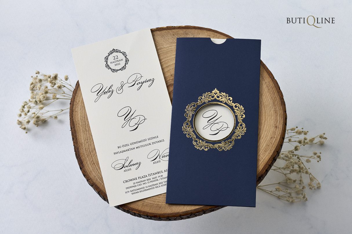 Ce faire part de couleur bleu avec des motifs doré qui ornent la pochette se constitue de deux éléments.