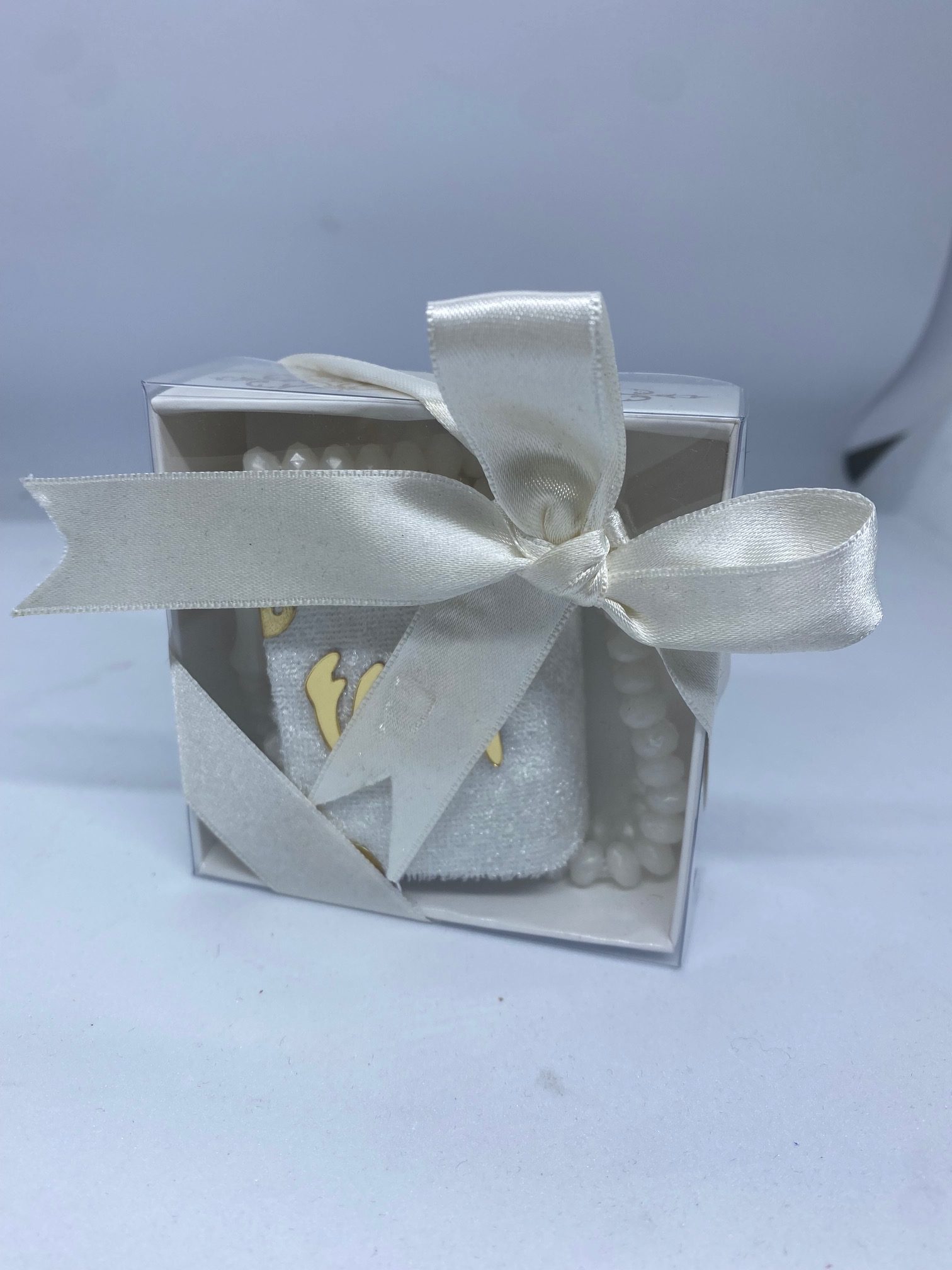 Cette petite boite contient un mini coran (entier) avec un petit de chapelet en blanc. La boite est ornée d’un petit ruban en forme de nœud.