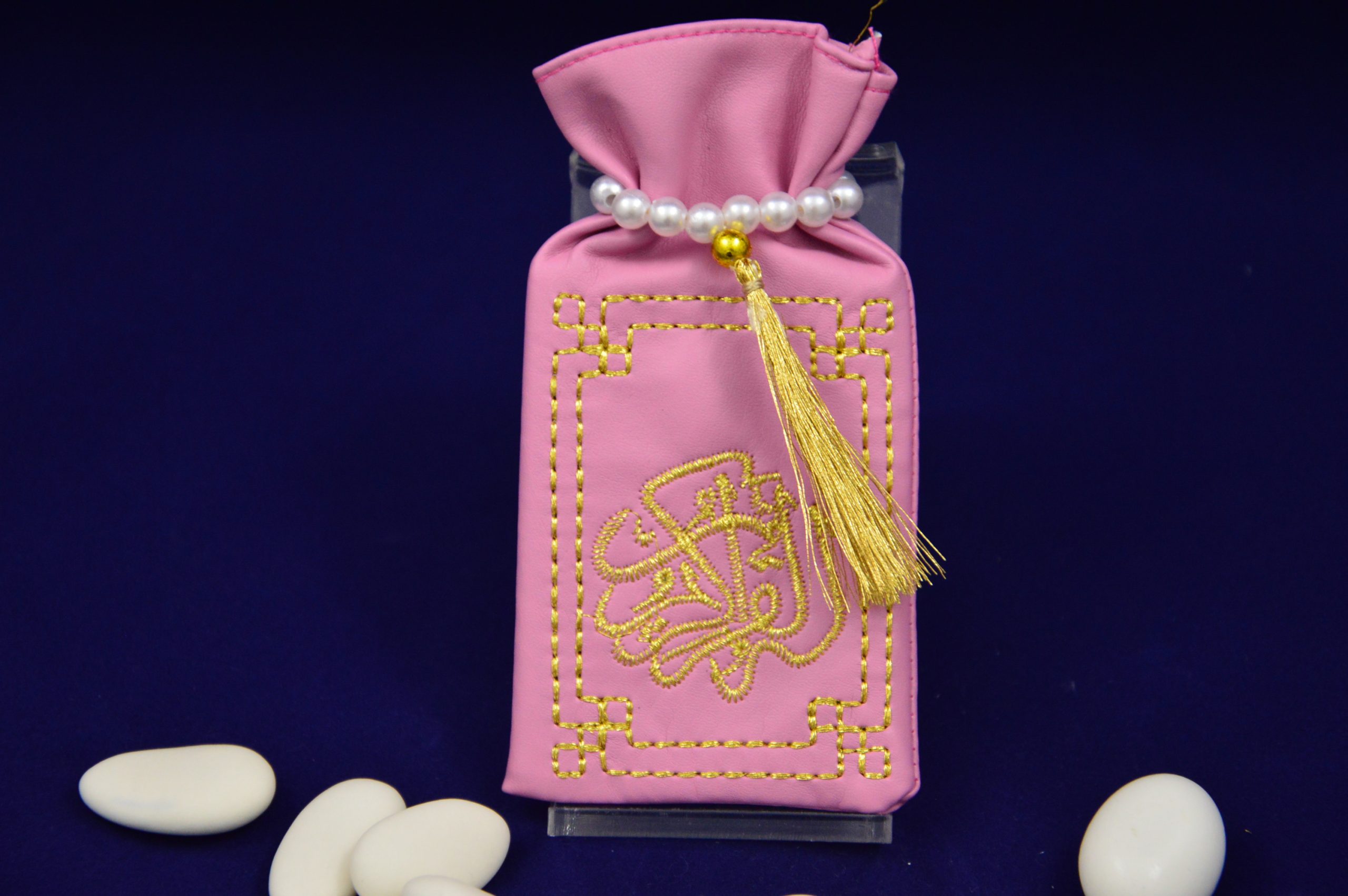 Ces pochettes de couleur rose avec des motifs doré contiennent un petit livre de Coran en arabe et français. C’est la dernière partie du Coran.